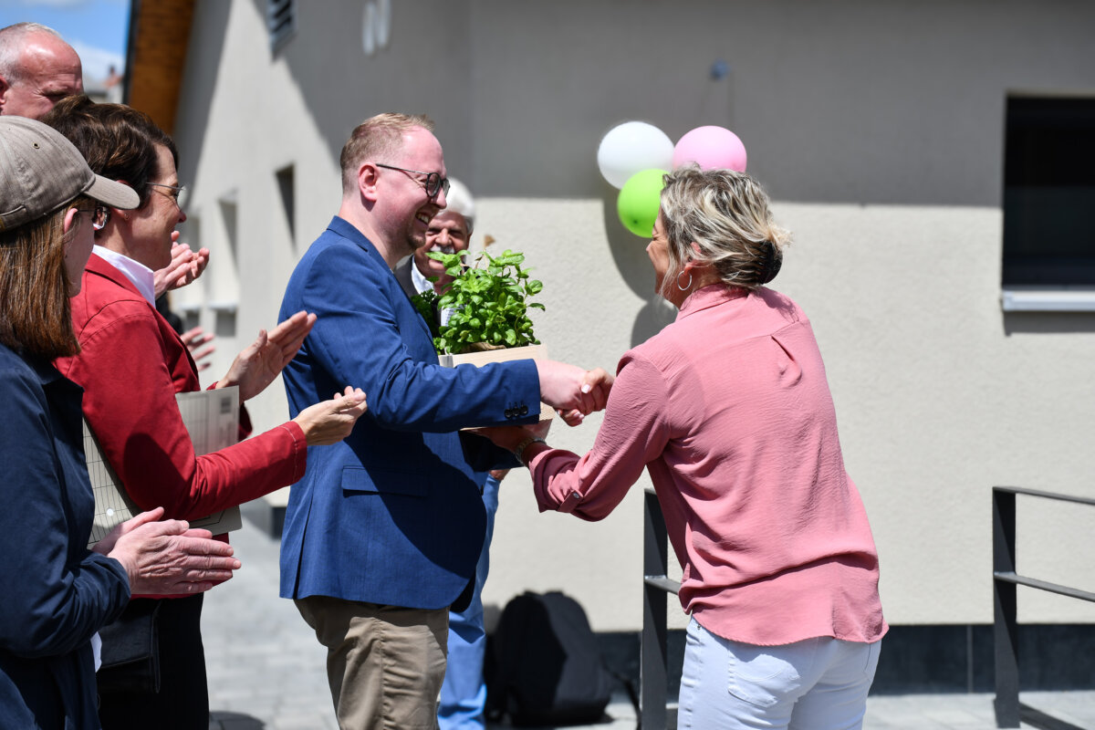 Stefanie Muskau vom verantwortlichen Architektenbüro Seidel & Muskau zeigte sich ebenfalls beeindruckt vom Ergebnis: „Damit wir heute hier so schön vor diesem Gebäude stehen können, mussten viele Handwerker sehr viel und sehr fleißig arbeiten.” Sie ergänzte: “Wir haben die Bausubstanz des Altbaus geprüft und konnten das ursprüngliche Kita-Gebäude aus den 50er Jahren erhalten. Bei der Gestaltung haben wir dann viel Wert darauf gelegt, dass die neuen Gebäudeteile gut mit dem Altbau harmonieren.“ Auch die Ökologie stand im Fokus: Wo immer möglich, wurden auf dem Kita-Dach Fotovoltaik-Flächen installiert: “So ist das Gebäude in einem sehr guten und zeitgemäßen energetischen Zustand.”