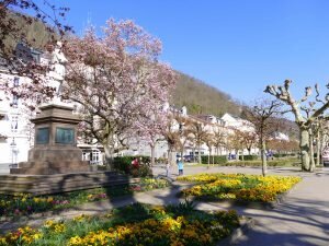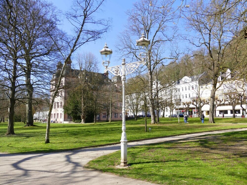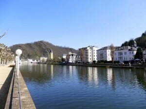 Sie steht direkt an der Lahn in Bad Ems. Auf der anderen Seite von der schön blühenden Lahn oder Kurpromenade.