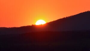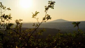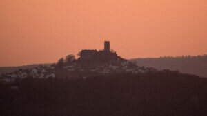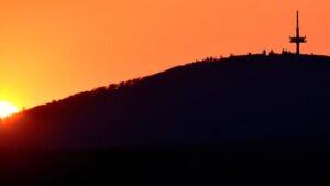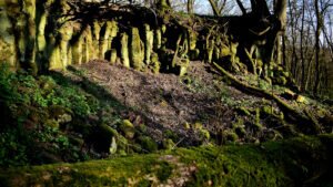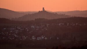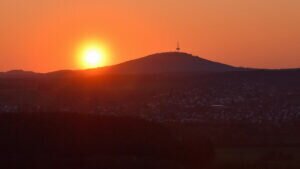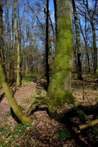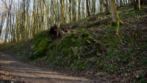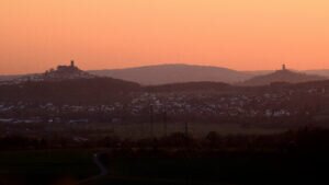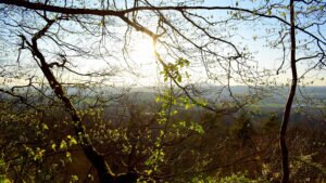 Meine Tagestour begann etwas ansteigend und nach einer ersten Gabelung, führte mich eine längere Wegstrecke, etwas absteigend, unterhalb eines Basaltkegels vorbei. Mein Vorhaben, den Aussichtspunkt, oberhalb der >Felsenkanzel< anzusteuern, zweigte nun der feste Waldweg linksseitig ab und stark ansteigend, schlängelten sich malerische Pfade durch den Wald des kleinen, noch intakten Naturschutzgebietes, die zusehends schmäler wurden. Zwischen Bruchholz und umgestürzten Bäumen vorbei, lief ich zu meinem Ziel, der >Schönen Aussicht< Dort angekommen, verweilte ich eine längere Zeit und das “Herz ging mir erst mal auf” – wie man sagt. Von diesem Aussichtspunkt geniest man einen großartigen weiten Blick zu den Burgen Gleiberg und Vetzberg, zum Dünsberg und bis hin nach Wetzlar. Es ist ein besonderes Erlebnis, von dieser Höhenklippe, zu jeder Jahreszeit, wundervolle Sonnenuntergänge aufzunehmen. Ein besonderer Augenschmauß – nach dem Verschwinden `unserer´ Sonne – über dem Horizont, der stimmungsvolle Abendhimmel mit verschieden aufleuchtenden Farben.