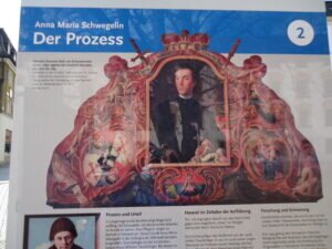 Dort entwickelten sich ihre religiösen “Wahnvorstellungen” weiter und sie erzählte den Mitinsassinnen allerhand Dubioses von ihrem Bund mit dem Teufel. Eine von ihnen zeigte sie dieserhalb beim Verwalter der Einrichtung an, worauf sie nach Kempten ins Gefängnis gebracht wurde. Es kam zu einem Prozess vor dem “Freien Kaiserlichen Landgericht” des Fürststiftes Kempten. Dessen Fürstabt war zugleich geistlicher und weltlicher Regent, sowie auch oberster Gerichtsherr. Der Richter Treuchtlinger, der den Prozess führte, hatte schon eine ganze Reihe von Hexenprozessen hinter sich und verurteilte die Schwegelinwegen Teufelsbuhlschaft zum Tode durch das Schwert. Gefoltert wurde sie nicht, sie hatte ohnehin alles gestanden. Sie betonte aber immerhin, daß sie niemandem einen Schaden zugefügt hätte.