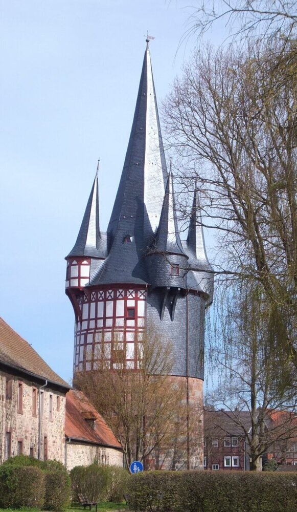 Auf den Resten einer Burg aus dem Jahr 1270 erbaute der landgräfliche Baumeister Hans Jakob von Ettlingen 1480 den Junker-Hansen-Turm, als einen Teil der Stadtbefestigung. Ursprünglich war der Turm als Bergfried geplant, am Ende wurde es ein Wohnturm.. Der Namensgeber war der hessische Hofmeister Junker Hans von Dörnberg. Schießscharten befinden sich im Unterbau, der Turm wurde aus vier Meter dicken Steinen errichtet. Romantik verleihen dem Turm die Erkertürmchen. Der Junker – Hansen – Turm hat eine Höhe von mehr als 50 m, sein Durchmesser ca. 13 m. Dieser Turm ist der größte Fachwerkrundbau Europas. In diesem Wohnturm fanden schon Hochzeiten statt, Führungen gibt es auch in verschiedenen Abständen.