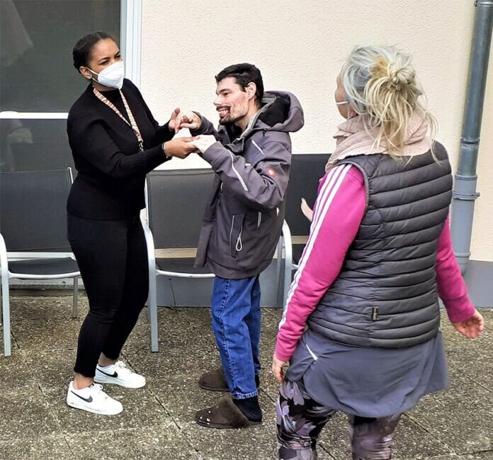 Danny Sterling machte vor Freude einen Luftsprung. Damit hatte niemand seiner Betreuer*innen gerechnet, denn seine Bewegungsabläufe sind durch Spastiken stark eingeschränkt. „Ich arbeite seit August in der Wohnstätte Staufenberg. So fröhlich und ausgelassen habe ich die Bewohner*innen in den letzten Monaten selten erlebt“, brachte Stacie Agyekum, Anerkennungspraktikantin, ihr Erstaunen über die Wirkung von Musik und Bewegung zum Ausdruck.