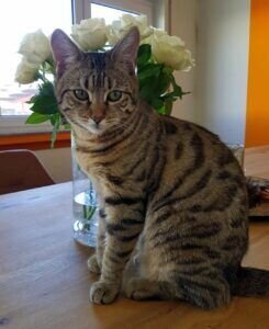 Sie wird im Juni ein Jahr alt. Sie ist eine große, fünf Kilo schwere Mieze, schlank und rank, aber der Bengale ist deutlich zu erkennen. Sie ist eine anhänglich, schmusige Katze mit einem aktiven, verspielten und verschmusten Charakter. Bisher war sie eine reine Wohnungskatze. Sie ist viel auf dem Balkon und schaut sehnsüchtig in den Garten. Sie zeigt deutlich, dass sie Freigang haben möchte.