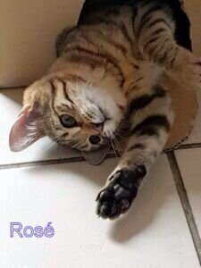Die wunderschöne Rosé ist ein Bengalmischling. Die Katzenmama war eine reinrassige Bengalkatze, der Papa unbekannt.