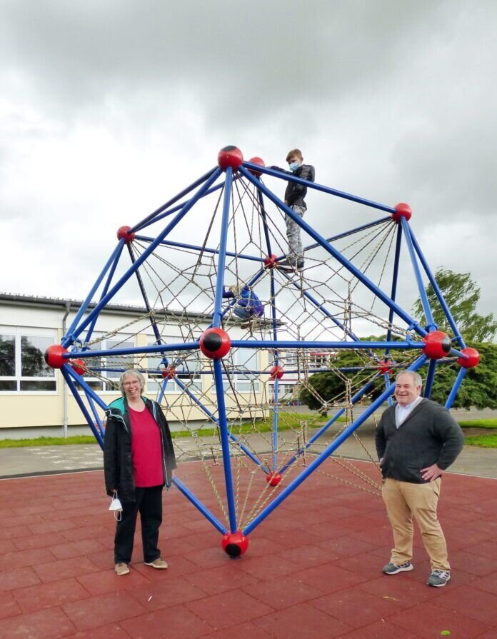 Für die ca. 200 Grundschüler der Regenbogenschule war jedoch der vier Meter Durchmesser hohe „Spaceball“, ein dem Brüsseler Atomium ähnelnder Gerüstbau mit eingesetztem Kletternetz und dem gepolsterten Fallschutzboden die besondere Attraktion. Denn hierin können die Kids nun in den Schulpausen umherklettern und damit für „mehr Bewegung“ auf dem Schulhof sorgen, so Konrektor Michael Jirschim. Er äußerte sich zudem hoch erfreut, dass sein Schul-Förderverein dieses Projekt mit 9500 Euro unterstützt habe, wodurch die Gesamtkosten von 36.500 € erheblich abgemildert wurden.