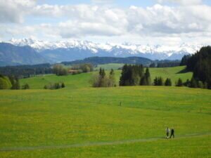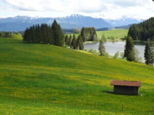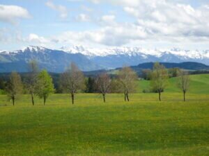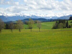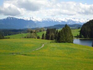 Hier Ausblicke vom Eschacher Weiher (1.000 m) im Allgäuer Voralpenland bei Buchenberg (Kreis Oberallgäu) in diesen Tagen. Der Schnee auf den Bergen hält sich dieses Jahr ungewöhnlich lange.