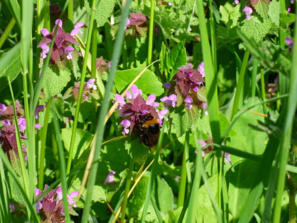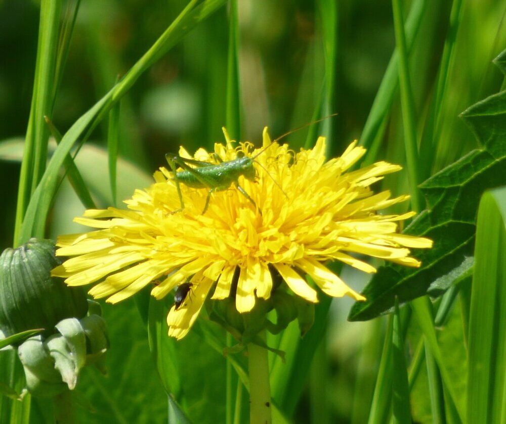 Nach dem Regen kommt der Sonnenschein und mit ihm die Blütenpracht. Rotdorn und Weißdorn leuchten um die Wette, darunter die weiße Lichtnelke. Margeritenblumen ziehen die Trauerrosenkäfer an, währenddessen die purpurrote Taubnessel bei den Hummeln beliebt ist. Auch das Schöllkraut, das Ackervergissmeinnicht und das Ackerstiefmütterchen sind erblüht. Der erste Mohn gibt rote Farbtupfer hinzu. An der Walderdbeere hängen erste kleine grüne Früchte. Die Babys der Heupferde mögen die gelben Blüten von Löwenzahn besonders gerne. Noch sind die Heuschrecken klein, doch bald werden sie gefürchtete Jäger sein. Malve, Königskerze und Johanneskraut legen ihre Kraft noch in den Wuchs. Dieses Jahr konnte das Pfaffenhütchen einmal viele Blüten hervorbringen. Die Blüten sind unscheinbar, was man von der Samenfrucht im Herbst nicht sagen kann. So schön das Pfaffenhütchen im Herbst leuchtet, so giftig sind seine Samen. Es ist eine Pflanze für das Feld und nicht für den Garten. Wilde Rose und Brombeere zeigen erste Blütenansätze. Der Holunder bringt die ersten Dolden zum Duften, in denen sich oft die veränderlichen Krabbenspinnen verstecken. Sie können ihre Farbe perfekt anpassen, solange der Untergrund weiß, gelb, braun oder grün ist. Es kommt Leben in die Wilde Ecke.