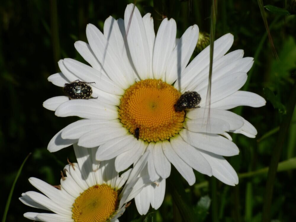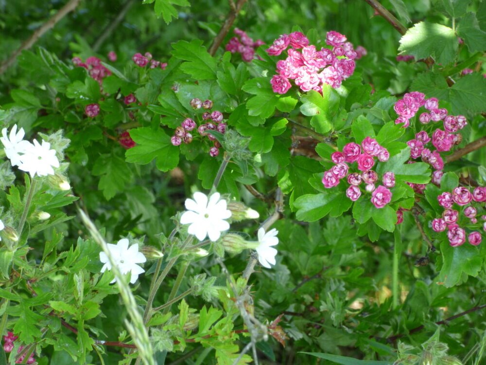 Nach dem Regen kommt der Sonnenschein und mit ihm die Blütenpracht. Rotdorn und Weißdorn leuchten um die Wette, darunter die weiße Lichtnelke. Margeritenblumen ziehen die Trauerrosenkäfer an, währenddessen die purpurrote Taubnessel bei den Hummeln beliebt ist. Auch das Schöllkraut, das Ackervergissmeinnicht und das Ackerstiefmütterchen sind erblüht. Der erste Mohn gibt rote Farbtupfer hinzu. An der Walderdbeere hängen erste kleine grüne Früchte. Die Babys der Heupferde mögen die gelben Blüten von Löwenzahn besonders gerne. Noch sind die Heuschrecken klein, doch bald werden sie gefürchtete Jäger sein. Malve, Königskerze und Johanneskraut legen ihre Kraft noch in den Wuchs. Dieses Jahr konnte das Pfaffenhütchen einmal viele Blüten hervorbringen. Die Blüten sind unscheinbar, was man von der Samenfrucht im Herbst nicht sagen kann. So schön das Pfaffenhütchen im Herbst leuchtet, so giftig sind seine Samen. Es ist eine Pflanze für das Feld und nicht für den Garten. Wilde Rose und Brombeere zeigen erste Blütenansätze. Der Holunder bringt die ersten Dolden zum Duften, in denen sich oft die veränderlichen Krabbenspinnen verstecken. Sie können ihre Farbe perfekt anpassen, solange der Untergrund weiß, gelb, braun oder grün ist. Es kommt Leben in die Wilde Ecke.
