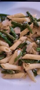 1.Knofi schälen u.fein hacken .Den Spargel waschen, holzigen Enden entfernen und in mundgerechte Stücke schneiden.Die Spitzen zur Seite legen,die kommen zuletzt dazu.Nudeln „al dente“ kochen,ca.3 Min vor Ende der Garzeit den Spargel dazu geben und mitkochen,die Spitzen etwas später.