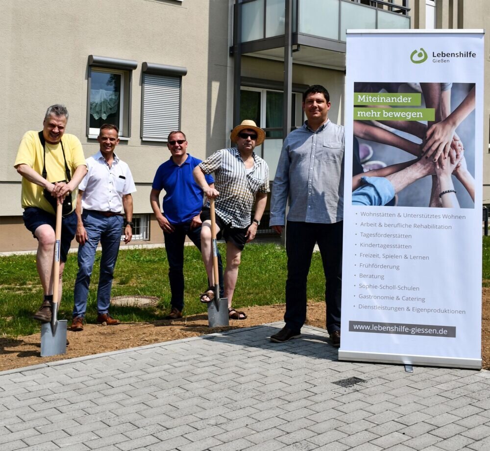 Giessen (-). Das Fundament steht bereits: Vor dem MitLeben-Gebäude der Lebenshilfe Gießen in der Fröbelstraße 76, wo in Kürze ein Außen-Pavillon als Treffpunkt und Ort des Verweilens für Menschen mit und ohne Behinderung fertiggestellt werden soll, kam es nun zum symbolischen Spatenstich.