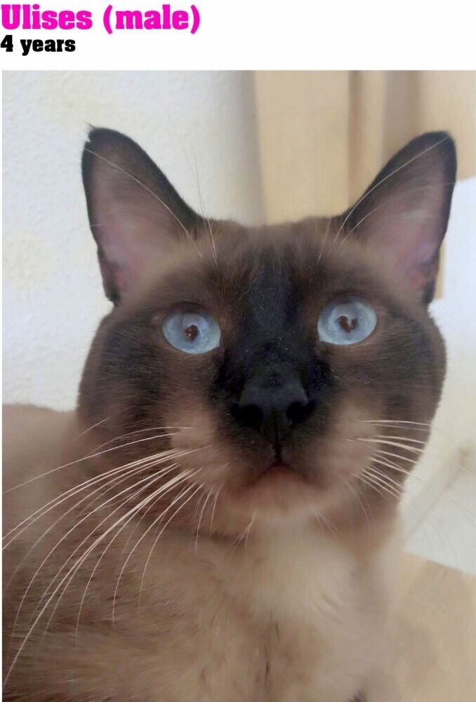 Der Siamkater ist wunderschön mit seinem aparten Fell und den blauen Augen. Er ist sehr menschbezogen und hält auch gerne ein “Schwätzchen”! Der Kater wurde in Spanien auf einem Markt als kleines Kitten für die Kinder gekauft. Als er erwachsen wurde und nicht mehr immer verfügbar sein wollte, hat man ihn im Tierheim unseres Patenvereins Arca de Noé abgegeben. Eine Pflegerin hat ihn bei sich Zuhause betreut und im einiges beigebracht! Von ihr wurden uns die Fotos zur Verfügung gestellt.