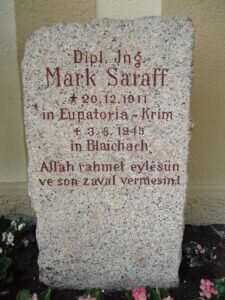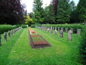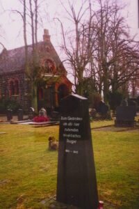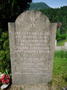 bereits erinnert. Ein Foto vom Gießener Neuen Friedhof mit dem Feld der dort bestatteten Sowjetbürger hatte ich schon mal in dem alten GZ-Auftritt im Netz eingestellt. Hier erneut. Die Inschrift auf dem Gedenkstein: “Zum Gedenken an alle hier ruhenden sowjetischen Bürger 1941 – 1945”. Es handelt sich um Kriegsgefangene und Zwangsarbeiter. Auch die Grabanlage im Alten Friedhof von Geesthacht hatte ich schon einmal vorgestellt. 25 erwachsene Zwangsarbeiter*innen und 15 Kinder von ihnen sind dort bestattet. Neu in der GZ ist unten das Grab für 4 Sowjetbürger Im malerischen Bergdorf Burgberg im Allgäu. Auch hier sind 4 russische Zwangsarbeiter und ihre Kinder bestattet. Ebenfalls völlig unverdächtig im schönen Allgäu befindet sich ein Grabstein für 4 Sowjetbürger und einen Holländer – war auch schon in der alten gz. Nun stand aber in der oben angeführten Liste der Botschaft, daß hier nicht 4, sondern 5 Sowjetbürger bestattet seien. Meine Netzsuche ergab, daß es außer dem Grabstein für die vier Sowjetbürger und den Holländer noch einen weiteren gab. Den hatte ich seinerzeit auch gesehen, aber nicht in Zusammenhang mit den KZ-Opfern gebracht: Dipl.-Ing. Saraff, geboren auf der Krim, der Inschrift auf dem Stein nach islamischen Glaubens (Allah habe ihn selig…beginnt sie), muß in Blaichach in dem Dachauer KZ-Außenlager gewesen sein, oder als Zwangsarbeiter in der Gegend. Sein Leben wäre wohl Stoff für einen Roman.