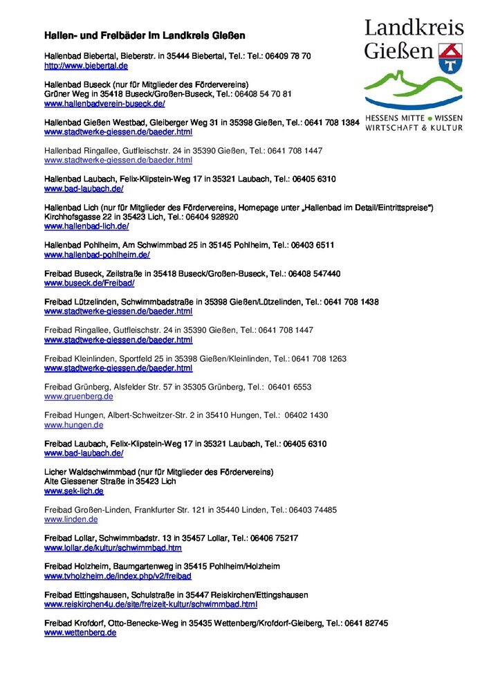 Freibad Kleinlinden, Sportfeld 25 in 35398 Gießen/Kleinlinden, Tel.: 0641 708 1263
