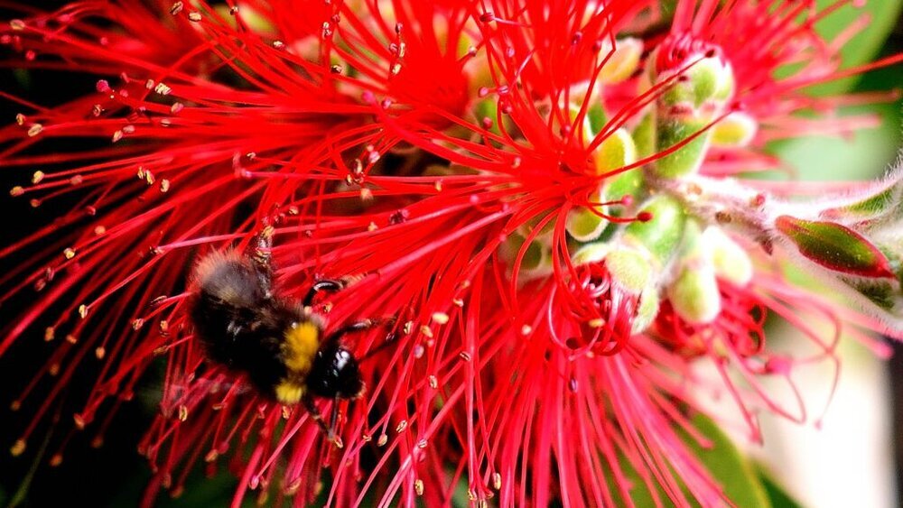 Hier noch einige Infos über Pflanze & Insekt: Die Pflanzen der Gattung Zylinderputzer (bot. Callistemon) stammen ursprünglich aus Ausstralien. Einige wenige Arten und deren Sorten werden als Zierpflanze in unseren Breitengraden kultiviert. Der Trivialname Zylinderputzer, auch Flaschenputzer oder Pfeifenputzer bezieht sich auf die Blüten der Pflanzen, welche in zylinderförmigen Blütenständen angeordneten sind und sehr dekorativ wirken. Eine immergrüne Gartenpflanze mit besonderer Wuchsform – nicht winterhart.