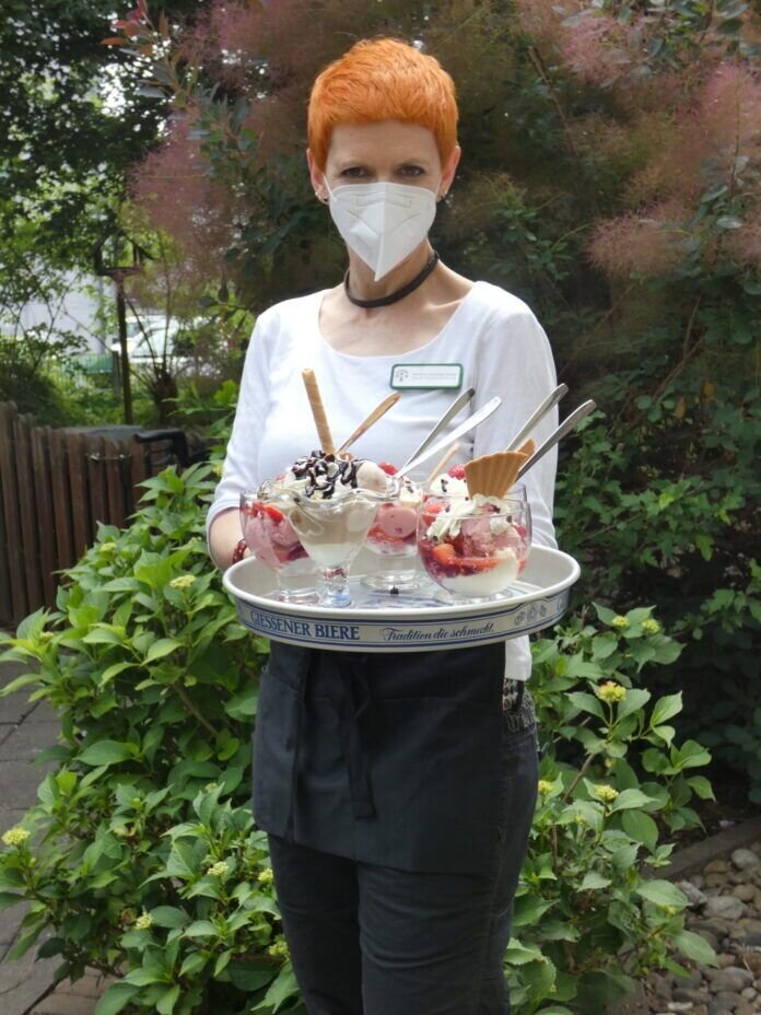 Die Verwaltungschefin höchstpersönlich zaubert die leckersten Eisbecher, natürlich gibt es auch eine zweite Portion und auf Wunsch – ein Mix aus allem.