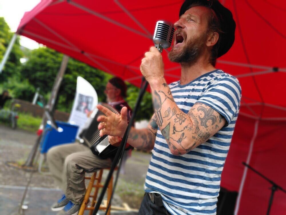 Ja man kann sagen die Katholiken haben „einen ganz besonderen Draht nach oben“ oder irgendjemanden „da oben“ gefällt das, was der Förderverein der Kulturkirche St. Thomas Morus e.V. da im Rahmen seiner „Sommerkulturkirche“ auf die Beine gestellt hat, ganz besonders. Jedenfalls öffnete sich just in der Zeit zwischen 16 und 17 Uhr ein Zeitfenster, in dem es trocken blieb und hin wieder sogar die Sonne durch die dichte Wolkendecke drang. Erst zum Ende des Konzerts setzte wieder leichter Regen ein. Die gewünschte Zugabe fiel dem nicht zum Opfer und auch die Stimmung beschrieb Akkordeonspieler Ludwig Metjé hinterher als äußerst ausgelassen und sehr entspannt.