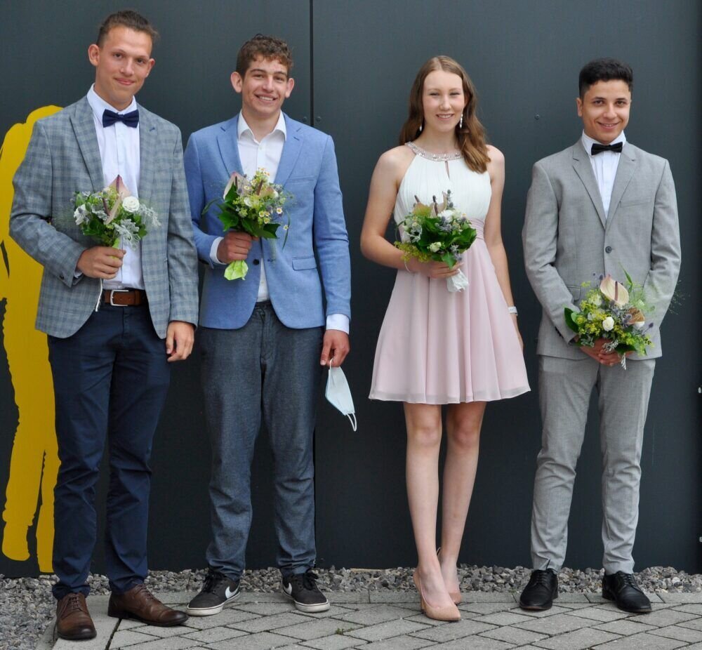 Bei der Zeugnisverleihung vorangestellt wurden vier Abgänger: Silas Förster erzielte die Note 1,4; Ole Weil wurde mit 1,5 geehrt und Marlena Kreis sowie Lucas Michel mit 1,6. Die beiden Klassenlehrer Alesa Burggraf und Dieter Glaum erwähnten nicht nur die Lernerfolge, die sie miterleben konnten, sondern auch die persönlichen Beiträge, welche die Schüler zur Atmosphäre und zum Gelingen des schulischen Miteinanders beigesteuert hatten. Alle erhielten ihre Zeugnisse und Blumen, um dann im Familienkreis an den kleinen Tischen anstoßen zu können.