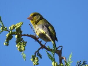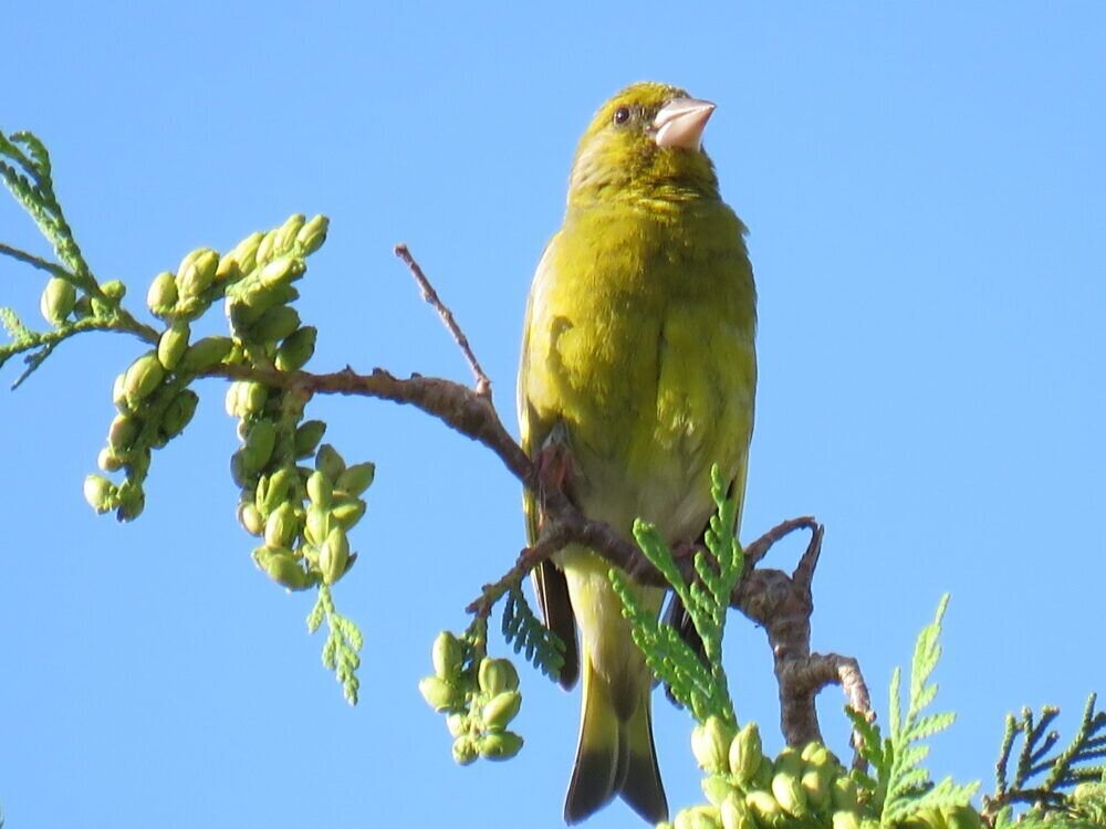 Im Sommer, wenn die anderen Vogelstimmen so langsam verstummen, dann kann der Grünfink des Öfteren mal gesehen und gehört werden. In der strahlenden Morgensonne und auf der Thuja Baumspitze trällert er seinen kanarienartigen Trillergesang, auch das Putzen des Gefieders gehört dazu! Seine Nahrung besteht aus Sämereien, Beeren, Knospen aber auch Insekten, der geht gerne an die Sonnenblumenkerne. Diese Thuja-Samen im Bild, gehören dann im Spätsommer und Herbst mit zu seiner Nahrung!
