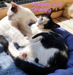 Die beiden Kitten sind im April 2021 geboren. Die Wurfgeschwisterchen haben bereits ein Zuhause gefunden. Die beiden Katerchen sind innig miteinander verbunden. Sie sollen ihr Leben gemeinsam verbringen und werden nur im Doppelpack vermittelt. Orestes sieht lustig aus mit einem schwarzen Ohr, einem halben schwarzen Schwanz und den schönen blauen Augen. Sie passen in eine Familie mit netten Kindern, denn sie sind ohne Scheu und immer zu einem Spielchen aufgelegt. Es sind typische “Flaschenkinder”, die den Mensch nur als Freund kennen. Und damit das so bleibt, möchten wir sie nur in reine Haushaltung vermitteln.