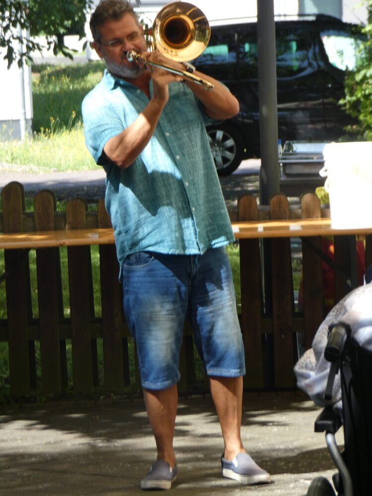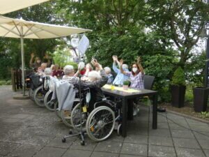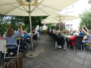 Karsten Weber aus dem schönen Hünfelden ist die Musik in die Wiege gelegt worden. Mit zahlreichen Instrumenten, seinem Humor und seiner mitreißenden Art begeistert er Bewohner und Personal gleichermaßen. Bei seiner Musik hält es unsere Bewohner kaum noch auf den (Roll)Stühlen – vergessen sind so manche Schmerzen, die Arme fliegen hoch, es wird geschunkelt und gesungen was das Zeug hält. Zwischendurch ein kühles Blondes, ein neues Prosit und weiter geht die Party. Unser tolles Küchenteam hat inzwischen das Buffet aufgebaut und serviert das Essen auf der Terrasse. Gemeinsam werden Würstchen und Salate verzehrt – dazu natürlich noch ein kleines Bierchen – denn das Fass muss ja schließlich leer werden 🙂