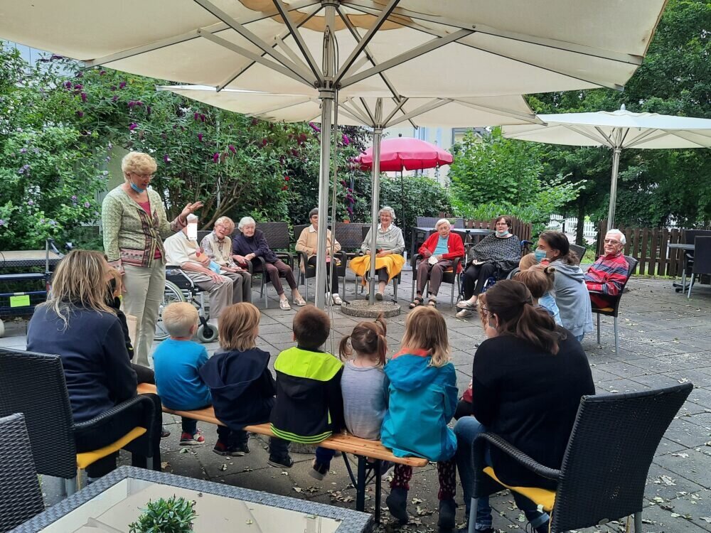 Heute war ein ganz besonderer Tag im Seniorenzentrum Haus Wiesecktal, denn es wurde besonderer Besuch erwartet. Das Empfangskomitee, bestehend aus Mitgliedern des Einrichtungsbeirates sowie weitere Bewohner, saßen in freudiger Erwartung auf der Terrasse. Gespannt wurde gelauscht, ob denn schon etwas zu hören ist. Ein Trippeln und Trappeln, Stimmen, die immer lauter wurden – und da kamen sie endlich : 12 Kinder vom benachbarten Kindergarten der Lebenshilfe Anne Frank Reiskirchen. Neugierig beäugten sich jung und alt. Ein erster zarter Austausch begann, denn schließlich hat man sich eine sehr lange Zeit nicht sehen können. Einrichtungsleitung Frau Ines Klingenmaier nahm die von den Kindern gebastelten Muscheln und Eistüten aus den Händen einer Erzieherin entgegen und verteilte diese an die Senioren. Die Begeisterung war groß und die Kinder wurden für ihre Werke sehr gelobt. Als kleines Dankeschön gab es einen Zauberkorb, aus welchem Frau Naujokat von der sozialen Betreuung für jeden ein leckeres Eis zauberte. Der anschließende Verzehr erforderte natürlich erstmal vollste Konzentration. Die Bewohner kamen aus dem Strahlen nicht mehr heraus, es ist berührend mitzuerleben, welche Wirkung die Anwesenheit von Kindern hat. Festgehalten wurde: Auch alle Omas und Opas waren mal jung und im Kindergarten. Mädchen fangen die Jungen (umgekehrt natürlich auch) und Hüpfekästchen wird damals wie heute noch gespielt. Die Begegnung von alt und jung war trotz Corona Abstand für beide Seiten sehr bereichernd und bis zum ersehnten Wiedersehen wird es hoffentlich nicht mehr so lange dauern.