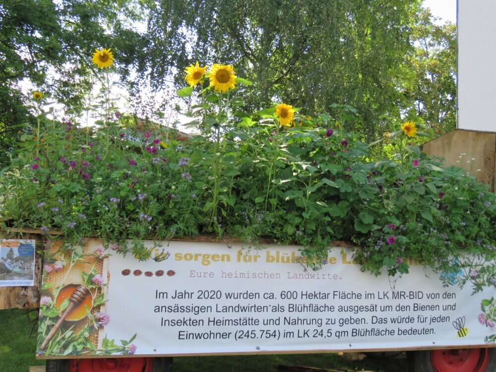Seit einiger Zeit steht der Aktionswagen vom Kreisbauernverband Marburg-Biedenkopf in Gladenbach beim Rathaus. In der Vergangenheit konnte ich in unserem Landkreis hier und da schon mal eine Exkursion über dieses Thema Biodiversität mit den Kreislandwirten so erleben. Es ist eine gute Aktion auch in diesem Falle, die Artenvielfalt auch in den eigenen Gärten zu stärken, das ist ein Ziel der heimischen Landwirte! Die Blühflächen lagen im letzten Jahr bei 600 Hektar im Landkreis Marburg-Biedenkopf, das sind rund zwei Prozent der Ackerfläche, was über (HALM) gefördert wird.