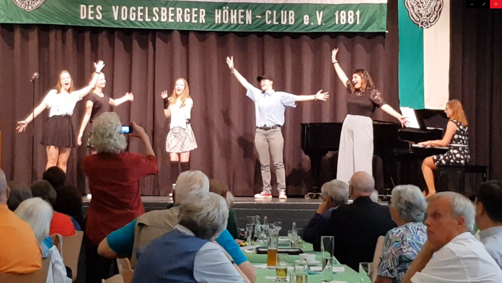 Am vergangenen Sonntag boten Schülerinnen der Musik- und Kunstschule Grünberg zum 140igsten Jubiläumsjahr des VHC einen Live Auftritt. Solo- und Chor Gesang mit Musik aus den 20iger umrahmten den Festakt. Die musikalische Gesamtleitung hatte die Leiterin der Musical AG, Gabriele Hierdeis, von der Musik-und Kunstschule Grünberg.