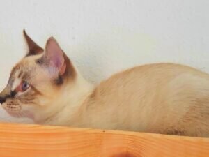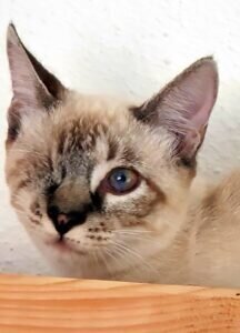 Der kleine Siam Siro hatte bei Aufnahme ins Tierheim ein verletztes Äuglein, was nicht mehr zu retten war. Er lebt als süßer “Pirat” fröhlich und ist in keiner Weise behindert.