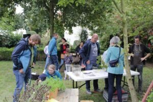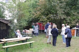 Die Bürgerinnen und Bürger von Rödgen waren eingeladen, den neu entstehenden Bürgergarten im ehemaligen Pfarrgarten zu besuchen. Der Dorf- und Kulturverein „Lebendiges Rödgen“ hatte ein Fest geplant, auf dem sich alle über den jetzigen Stand und die geplanten Maßnahmen informieren konnten. Ein großes Kuchenbuffet und gemütliche Sitzgelegenheiten luden zum Verweilen ein und man kam schnell ins Gespräch. Am Stand der Hedwig-Burgheim-Schule konnten verschiedene Kräuter erraten und probiert werden. Nebenan hatte Barbara de Jong außergewöhnliche Tiere mitgebracht, die besonders bei den Kindern Begeisterung hervorriefen. Eine große Achatschnecke, ein wandelndes Blatt oder eine Stabschrecke auf der Hand zu haben, war ein Erlebnis. Wer Interesse hatte, sich an der naturnahen Gestaltung und Bepflanzung zu beteiligen oder beim Anlegen eines Barfußpfades mitzuhelfen, konnte sich in dafür vorgesehene Listen eintragen. Vielleicht entsteht auch ein Insektenlehrpfad oder eine Kräuterspirale. Vieles ist möglich und eine Bürgerbeteiligung erwünscht. Unabhängig vom Bürgergarten konnten sich die Besucher auch darüber austauschen, was sie sich sonst für ihren Ort wünschen: vielleicht einen regelmäßigen Flohmarkt oder eine Tauschbörse? Die Initiatorin Farida Schwabe war erfreut über den großen Zuspruch und informierte die Anwesenden zusammen mit Ellen Böttcher vom Dorf-und Kulturverein über die bisher durchgeführten Arbeiten im Garten und die Zusammenarbeit mit dem örtlichen Kindergarten und der Grundschule. Sie dankten allen Helfern, die bei der Vorbereitung und Durchführung des Festes geholfen haben. Viele Rödgener wollen sich gemeinsam auf den Weg machen, einen besonderen Begegnungsort für ihren Stadtteil zu schaffen.