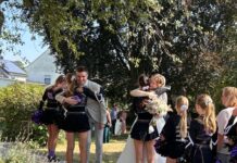 Das Bild zeigt die beiden Teams vor dem Anpfiff. Gießen in Grün.