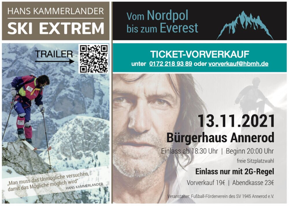Der Fußball-Förderverein des SV Annerod präsentiert am 13.11.2021 einen Vortrag des Südtiroler Spitzenalpinisten Hans Kammerlander im Bürgerhaus Annerod – unter Einhaltung der 2G-Regel. Einlass ist um 18:30 Uhr, Beginn um 20:00 Uhr.