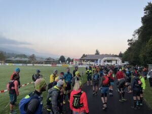Ausfälle gibt es schon vor dem Start, denn von den 418 gemeldeten Läuferinnen und Läufer des „Großen“ stehen lediglich 317 erwartungsvoll hinter der Startlinie. Die schon fast winterlichen Temperaturen, die auf den Gipfeln der Tausender noch niedriger sind, haben wohl einige abgeschreckt. Aufgrund der jeweils selbst geschätzten Zielzeit, reihe ich mich im fünften und letzten Startblock ein. Fast das gesamte Startfeld befindet sich vor mir, aufgrund der Kälte dampft jeder Atemzug der über dreihundert Menschen, ein imposanter Eindruck.