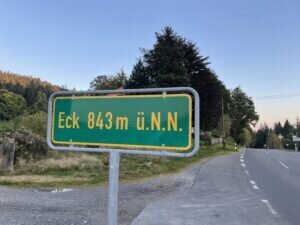 Nach einem kurzen Straßenabschnitt geht es durch Wald- und Wiesenabschnitte hinauf aufs „Eck“ (843 m ü.N.N.) mit Verpflegungsstation und gleichzeitig auch Zeitkontrolle (V1/K1). Gut 350 Höhenmeter sind geschafft und dies bereits auf den ersten acht Streckenkilometern. Diesen Wertungspunkt habe ich in 1:24:17 Stunden erreicht und damit das Limit der Cut-Off-Zeit erfüllt. Schnell den rechten Schuh ausziehen, einen quälenden Stein daraus entfernen und eine halbe Banane mitnehmen, die auf den nächsten Metern verspeist wird. Hier heißt es auftanken, denn das bevorstehende Teilstück bis V2 wird der längste, härteste und technisch anspruchsvollste Abschnitt dieses Rennens. Durchhalten bis zu Verpflegungsstation 2 ist angesagt.