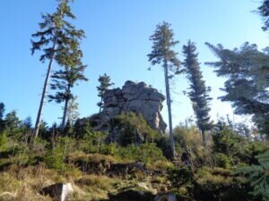 Das Wetter ist optimal. Blauer Himmel, Sonnenschein und hier oben so um die 10 Grad. Der Wind hält sich in Grenzen und so kann ich ab und zu mal einen Blick ins wunderschöne Tal und auf den gegenüber liegenden Höhenzug, das „Künische Gebirge“, werfen – und genießen. Doch das alles muss im Laufschritt erfolgen.