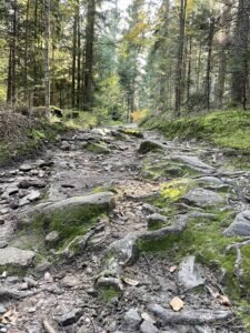 Hätte ich in der Zeit gelegen, hätte ich mir den Anstieg zum Zwercheck (1333 m) über stark verwurzelte und verblockte Trails noch zugetraut. Jedoch hätten meine Knie den darauf folgenden Abstieg zur Forststraße nicht mehr mit gemacht.