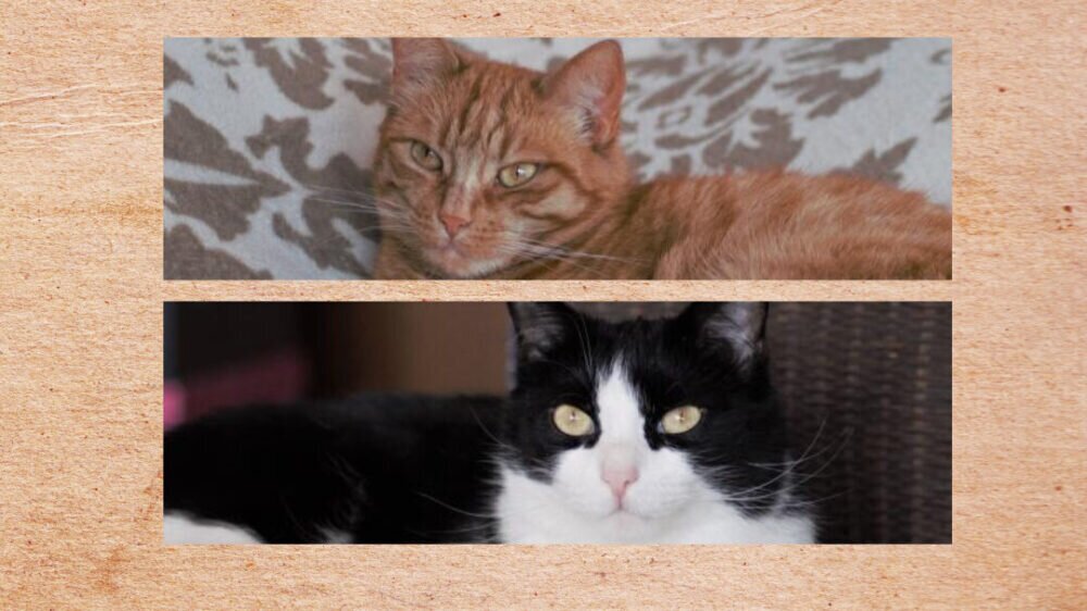 Stammdaten: Fiona – EKH, rot, Katze, kastriert, Alter nicht bekannt, Wohnungskatze. Oreo – EKH, schwarz mit weiß, Kater, kastriert, Alter nicht bekannt, Wohnungskatze.