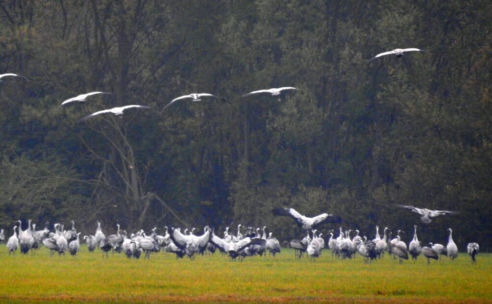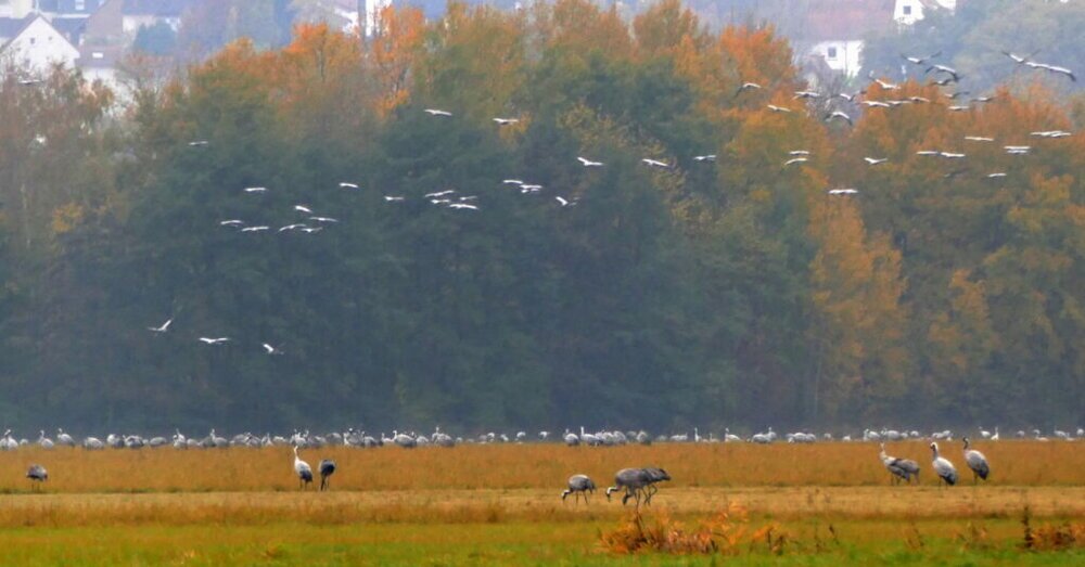 Ja wir standen, zwei Ornithogen neben mir und konnten beobachten wie die Leute mit ihren Hunden immer weiter auf die Kraniche zuliefen. Wir haben geufen und gestieguliert aber sie haben es nicht mitbekommen. Einmal war es aber auch ein Reh daß die Kraniche auffliegen ließ. Ich habe es auch erst jetzt veröffentlicht nachdem die Kraniche weg waren. Aber es war einmalig schön da die Kraniche ja immer nur die Lahnaue überfliegen.