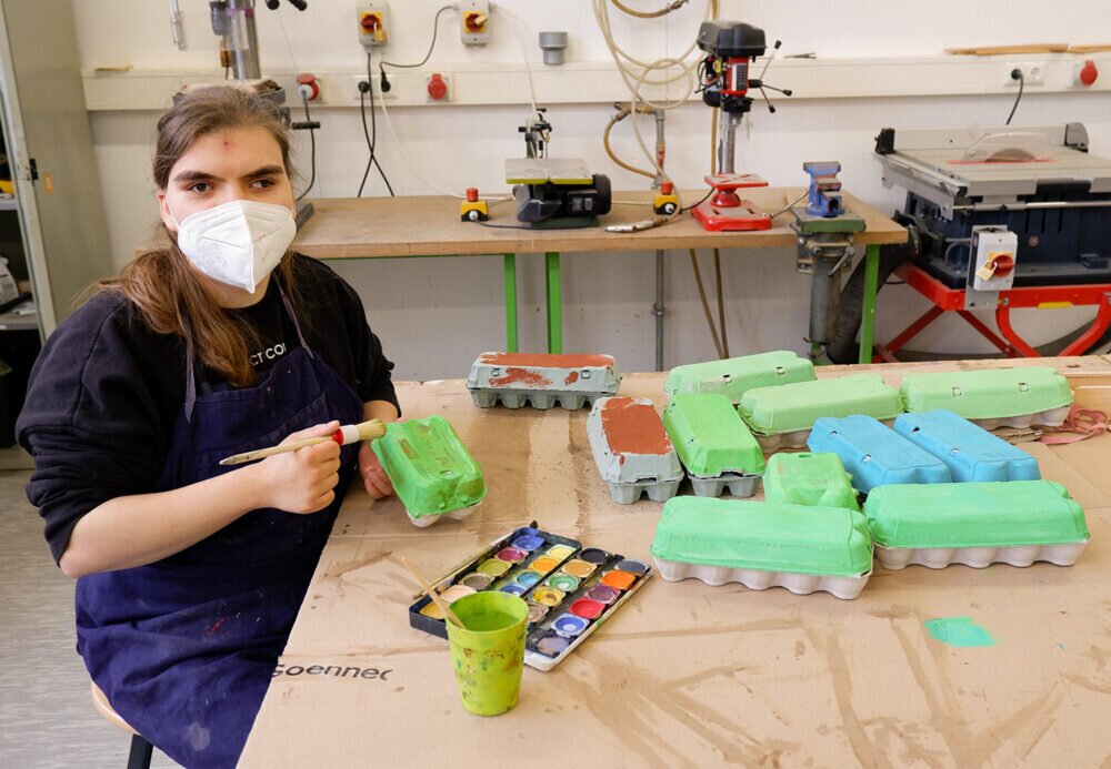 Die Vernetzung mit anderen Tagesförderstätten erzeugt neben Verbundenheit mit dem Sozialunternehmen auch Synergien. So werden im Eingangsbereich und der Tagesförderstätte Lollar beispielsweise Eierkartons bemalt, die anschließend in der Einrichtung in Lollar mit Eiern gefüllt und an Kunden ausgefahren werden. Jeder Eierkarton ist ein Unikat und erfreut die Kunden. „Wir sind ständig auf der Suche nach Innovationen, die unseren Beschäftigten eine sinnvolle und befriedigende Arbeit ermöglichen“, erklärt Fabian Gottwalz. Aktuell stehe die Herstellung von Regalen aus Europaletten bei den Beschäftigten hoch im Kurs. Diese Arbeiten können in der hauseigenen Holzwerkstatt durchgeführt werden.