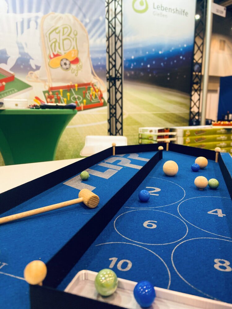 Giessen/Essen (-). Die „SPIEL“ in Essen ist die weltweit größte Publikumsmesse für Spiele und für alle Brettspiel-Fans das Highlight im Jahreskalender. Über 90.000 Besucher*innen aus aller Welt statteten der Messe im Oktober einen Besuch unter strengen Hygieneauflagen ab. Unter den 620 Ausstellern aus 41 Ländern befand sich auch ein Stand der Lebenshilfe Gießen. Neben den beliebten Fußball-Billard-Spielen „FuBi 2.0“, ab sofort auch in farblichen Variationen erhältlich, und „FuBi to go“ begeisterte das Lebenshilfe-Messeteam der Reha-Werkstatt Gießen, einer Rehabilitationseinrichtung für Personen mit chronisch-psychischen Erkrankungen, die Besucher*innen mit seinem neuesten Spiele-Coup: „Flippi“.