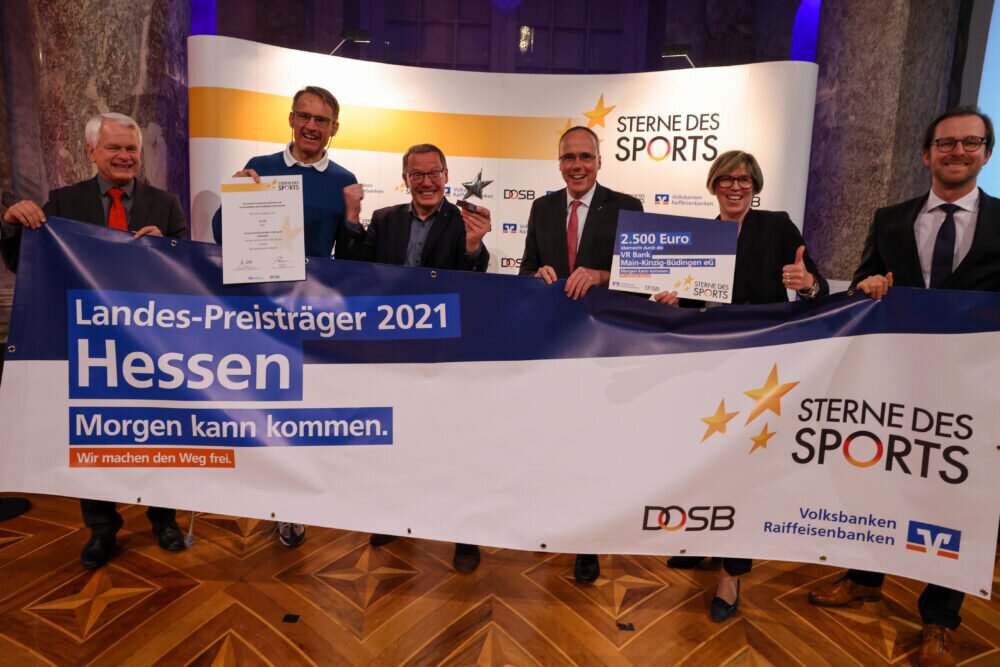 Wiesbaden/Laubach. Verdienter Lohn für sportliche Initiativen mit Vorbildcharakter: Sechs von 106 teilnehmenden Sportvereinen aus Hessen hatten es beim Wettbewerb „Sterne des Sports“ bis zur Endrunde auf Landesebene geschafft. Unter ihnen der Tennisclub Laubach (TCL), der seine Bewerbung bei der VR Bank Main-Kinzig-Büdingen eingereicht und im Sommer schon den Regionalwettbewerb mit seinem Inklusionsprojekt „Tennis für alle“ gewonnen hatte. Und auch auf Landesebene landete man jetzt auf dem Siegertreppchen ganz oben. Im Wiesbadener Schloss Biebrich überreichte Hessens Innen- und Sportminister Peter Beuth dem rührigen Verein kürzlich den „Großen Stern des Sports“ in Silber und 2.500 Euro Preisgeld. Zusammen mit den 15 Siegervereinen der anderen Bundesländer ist der TCL jetzt für den 24. Januar 2022 nach Berlin zum Bundesfinale eingeladen. Bundespräsident Frank-Walter Steinmeier zeichnet dann die drei bundesweiten Siegervereine persönlich mit dem goldenen „Stern des Sports“ aus – die Laubacher dürfen hoffen!