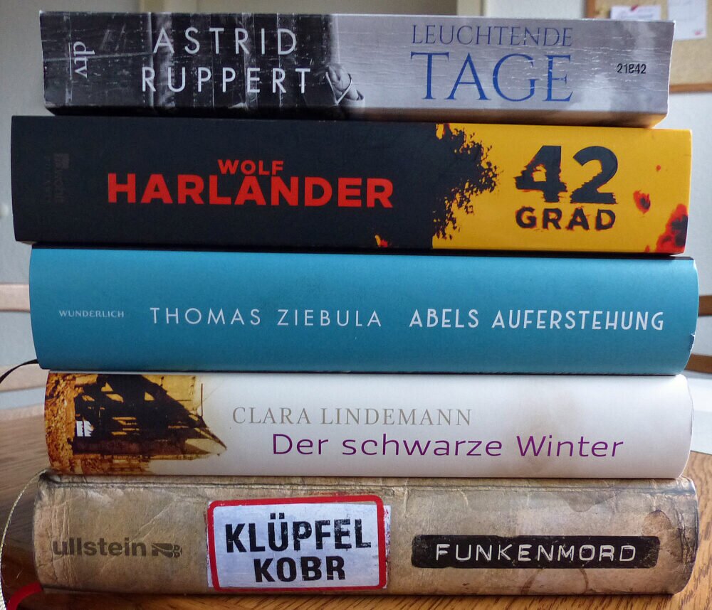 „Funkenmord“ von Volker Klüpfel u. Michael Kobr. – Kommissar Kluftinger will einen 30 Jahre alten Fall aufklären, den Mord an einer jungen Lehrerin. Er ist ist überzeugt davon, dass er sich damals vorschnell auf einen Täter festgelegt hatte. Daneben muss er sich auch noch um den Haushalt kümmern, da Gattin Erika erkrankt ist. Die Funktion der Waschmaschine bereitet ihm fast mehr Schwierigkeiten als die Mördersuche und der vertretungsweise Besuch einer Thermomix-Party bei Erzfeind Dr. Langhammer endet anders als von Klufti gewünscht. Wie gewohnt unterhaltsame Lektüre.