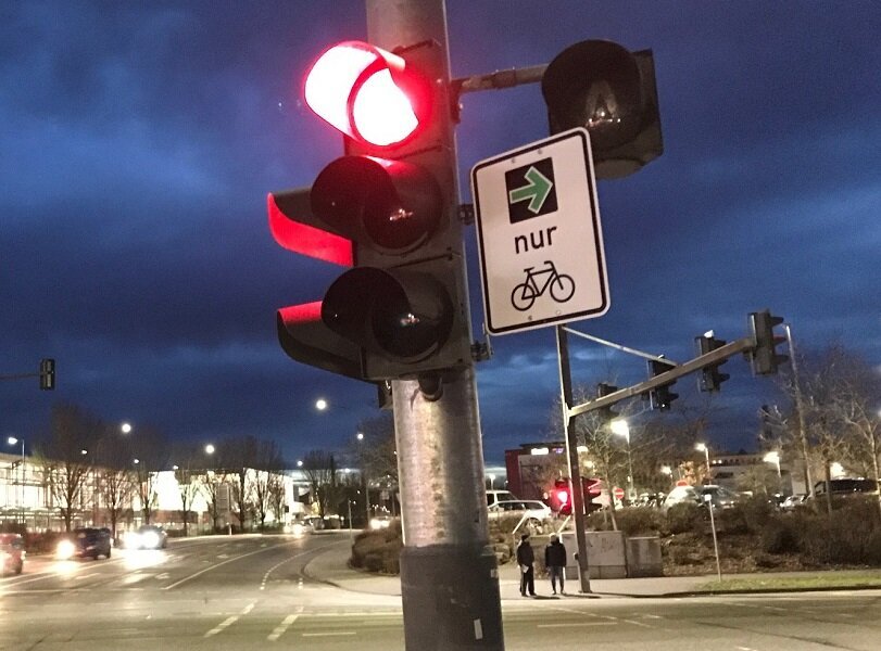 Wenn die Stadtverwaltung alle Vorschläge umsetzt, dürfte bald an mehr als der Hälfte der Ampelzufahrten in Gießen bei Rot das Rechtsabbiegen für den Radverkehr möglich sein. ADFC Vorstandsmitglied Jan Fleischhauer kann sich aber in der Zukunft noch weitere Grünpfeile in Gießen vorstellen, denn nicht alle derzeit gültigen Ausschlussgründe sind aus seiner Sicht sinnvoll. Wenn der Radverkehr z.B. auf einen benutzungspflichtigen Radweg nach rechts abbiegt, dann ist es kein Problem, wenn der Gegenverkehr einen leuchtenden grünen Pfeil angezeigt bekommt, weil sich die Fahrlinien von Rad- und Autoverkehr gar nicht berühren. Fleischhauer geht daher davon aus, dass die neue Bundesregierung den Kommunen bald noch mehr Spielraum für die Installation der Rad-Grünpfeile geben wird – das Land Nordrhein-Westfalen hatte das per Erlass schon vor einigen Monaten ermöglicht.