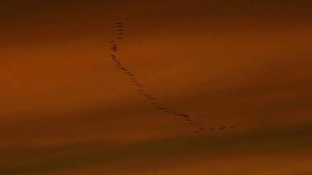 Für mich als Naturfotograf wieder beeindruckend, das Naturschauspiel der Kranichzüge, zusammen mit einem malerischen Abendhimmel.