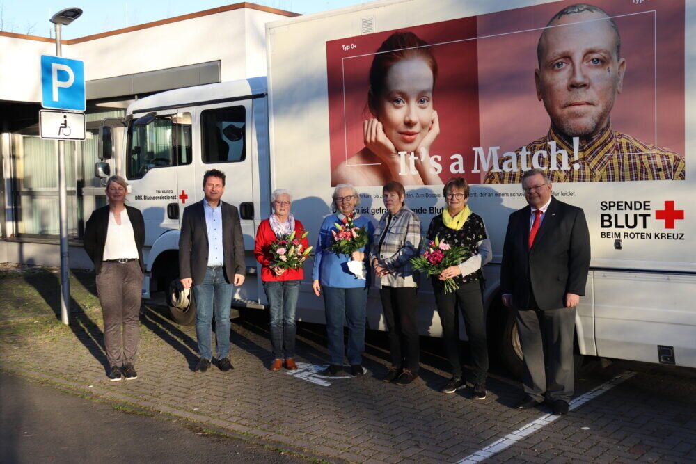Ulrich Welter (re), Almut Roth und Ralf Debus (1. u. 2 v. li) vom DRK-Blutspendendienst bedankten sich bei Hannelore Scharmann, Helga Schmidt, Liesel Schötterl und Inge Kraus (Mitte v. l.) für das langjährige ehrenamtliche Wirken für das Deutsche Rote Kreuz