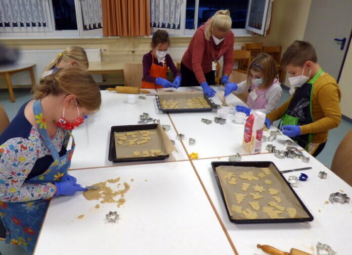 Nicht nur mit Maske ausgestattet, sondern auch mit Schürzen und Handschuhen war die dritte Gruppe zu beobachten, die im Kreativraum-B den Plätzchenteig ausrollten und anschließend mit Förmchen und Eigenkreation die Figuren herstellten. Bevor die Bleche dann im Backofen der kleinen Küche verschwanden, wurden sie noch mit Zuckerguss bestrichen und mit bunten Streuseln dekoriert.