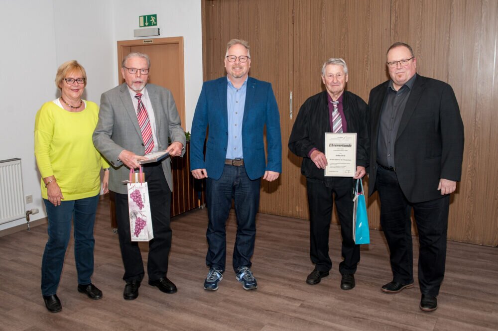 Geehrt wurden die beiden Anwesenden Gerhard Pieh für 40 aktive, Klaus Leib, Reiner Mülich und Dieter Reinhardt für 40 passive sowie Arthur Stroh für 70 passive Jahre. Die beiden Anwesenden erhielten vom Vorstandsteam Ehrenurkunden und ein kleines Präsent.