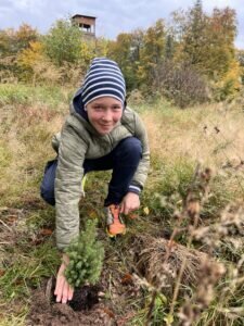 Andere Projektgruppen beschäftigten sich mit den Mitgeschöpfen aus dem Tierreich; folgende Pläne wurden verwirklicht: Futter ins Tierheim bringen, für Tiere dort Werbung machen und die Vermittlung ankurbeln, Vogelfutterhäuser oder Insektenhotels basteln und dabei durch Recycling keine neuen Ressourcen verbrauchen. Ihr Bienenschutzprojekt begründeten Joaquin und Sean so: „Wir haben uns gedacht, wenn wir Bienen schützen, sind wir ein guter Teil von etwas Großem; denn ohne Bienen ist kein Leben möglich.“ Einen weiten Blick bewiesen auch Fritz und Paul aus Klasse 6b: Für die Aufforstung im Wald kauften sie nicht nur junge Bäume ein, sondern pflanzten auch vorher sorgsam gewonnene Bucheckern und Tannenzapfen. Einen guten Beitrag leisteten auch die Schulkinder, die zwar nicht etwas neu Geschaffenes präsentieren konnten, dafür aber etwas entfernt hatten: Durch fleißiges Müllsammeln verbesserten sie die Lebensbedingungen in der näheren Umwelt.