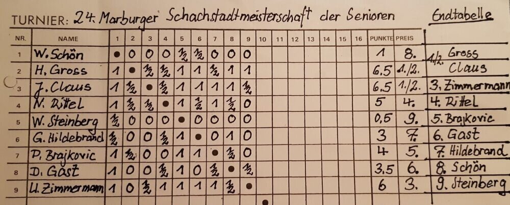 Nachdem 2020 keine Stadtmeisterschaft ausgetragen wurde, fanden sich jetzt neun Senioren bereit, in einem Rundenturnier Jeder gegen Jeden, wieder an die Bretter zu gehen. In den vergangenen Jahren traf man sich hierzu immer am Südbahnhof bei den Sehbehinderten. Da Dr. Otto Hauck diesmal nicht teilnehmen konnte, wurde im Spiellokal des SKM im Südstadttreff in der Schwanallee gespielt. Von der „Alten Garde“ der früheren Jahre fehlten auch Dr. Gerhard List, Jakob Kicler und Willi Beckers. Wir hoffen auf ein Wiederkommen von ihnen im Jahr 2022. Neu dazugekommen sind Georg Hildebrand und Wolfgang Steinberg. Wolfgang war nicht nur Schlüsselträger für das Spiellokal, sondern auch „Guter Geist“ für die Organisation rund um das schöne Vereinsheim. Aufschließen, Kaffee kochen, Geschirr Bereitstellen und später Wegräumen, Aufräumen, nach dem Rechten sehen und am Ende Abschließen. Nochmal herzlichen Dank dafür!