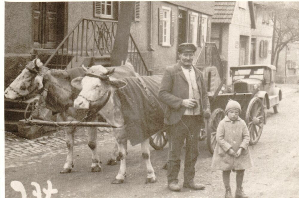 Das Foto entstand um 1933 in der Marktstraße vor dem Haus 7, der jüdischen Familie Adolf und Karoline Stiebel. Philipp Kraus, der in der oberen Marktstraße wohnte, steht vor seinem Kuhgespann, das einen Wagen mit eisenbereiften Holzrädern zieht. Neben ihm ist sein Enkel Erich Conrad, geb. 1928 zu sehen.
