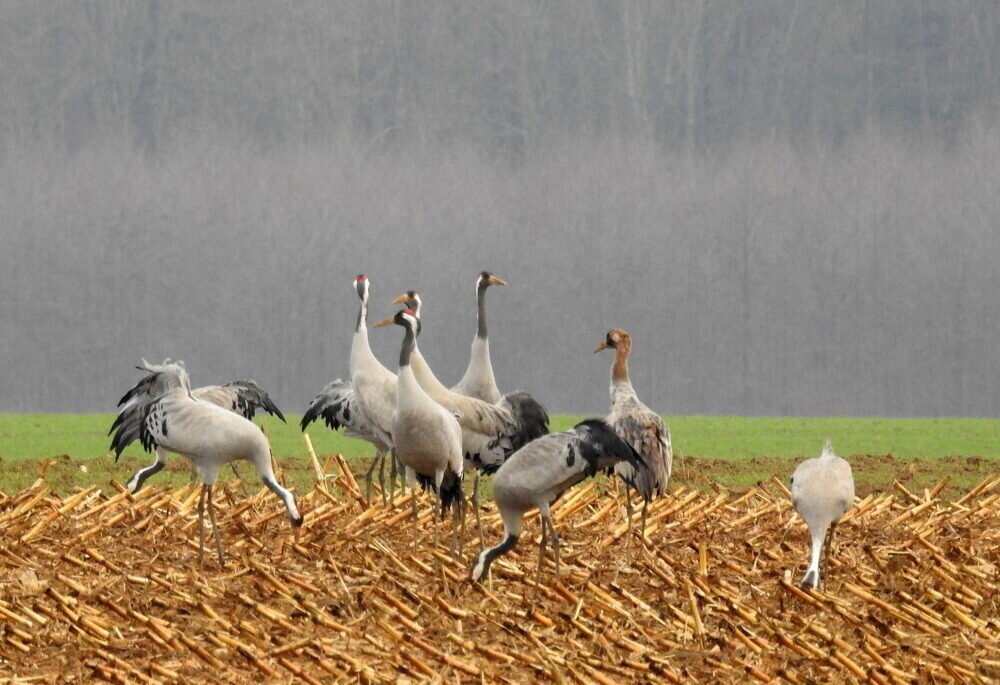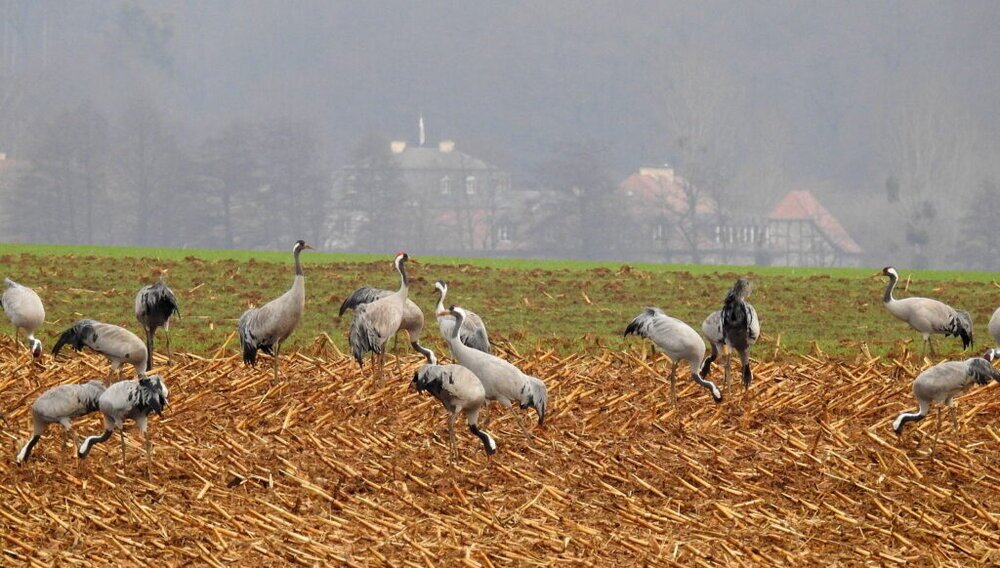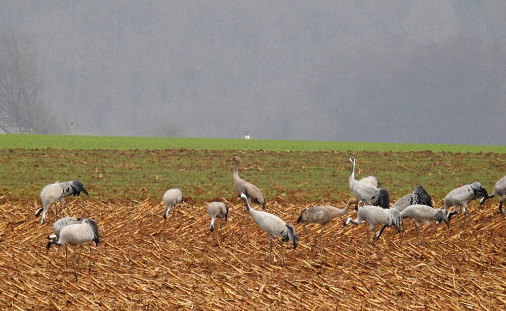 Sehr schön Irmtraut, im Fernsehen und Radio wurde es schon mehrfach erwähnt, sie halten sich in dem Bereich der Wetterau auf. Auf den Bildern kann man vereinzelt die jungen Kraniche mit ihrem bräunlichen Kopf sehr gut erkennen!